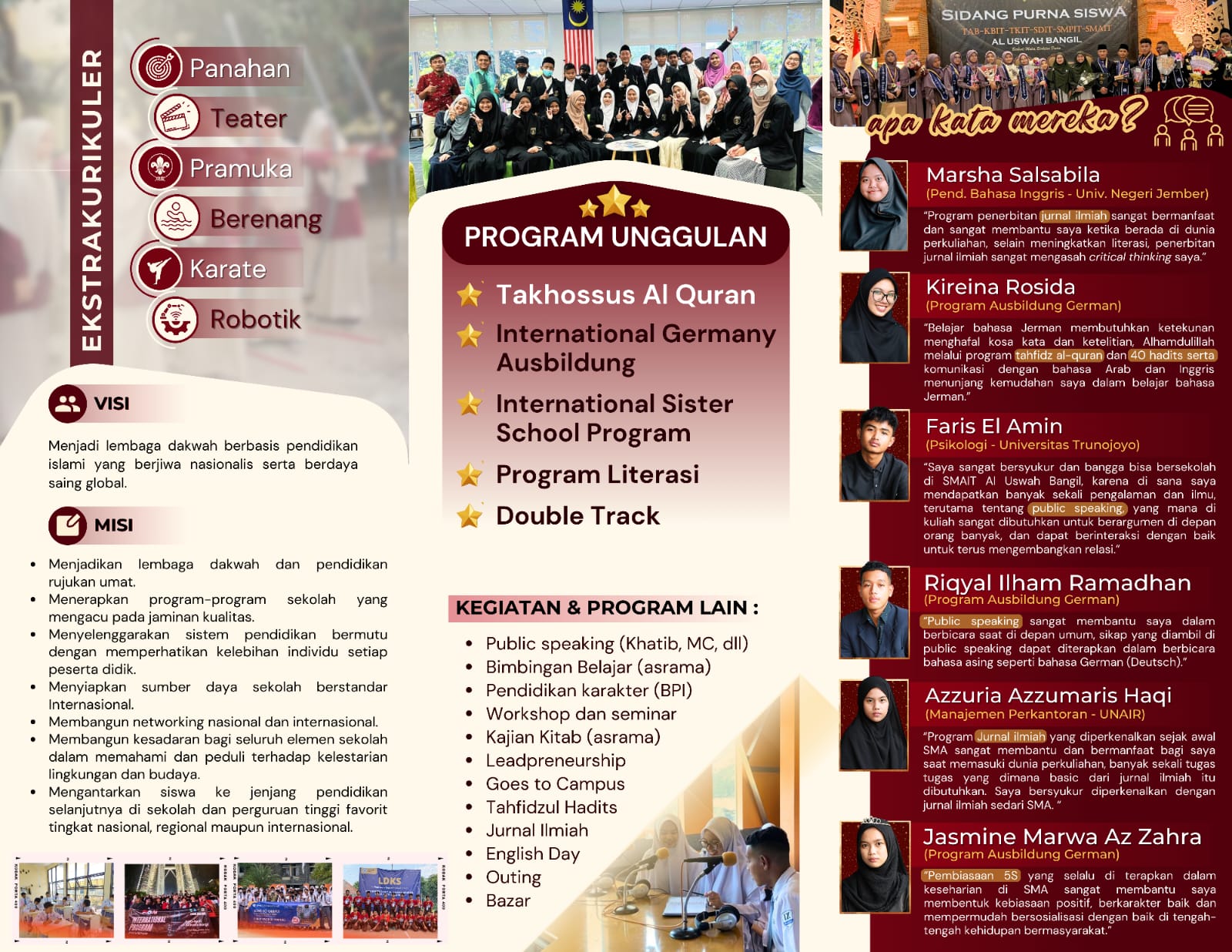 Jangan biarkan impian untuk menjadi bagian dari masyarakat dunia hanya harapan belaka. Ambil langkah pertama sekarang dan daftarkan diri ke kelas internasional persiapan kuliah kerja dan dakwah ke Jerman di SMAIT Al Uswah Bangil. Bersiaplah untuk melangkah maju dalam mencapai mimpi-mimpi kalian dan menjadi generasi yang penuh inspirasi, sukses, dan berdampak positif. Bersama-sama, kita akan meraih kesuksesan dan berkontribusi dalam membangun masa depan yang gemilang.